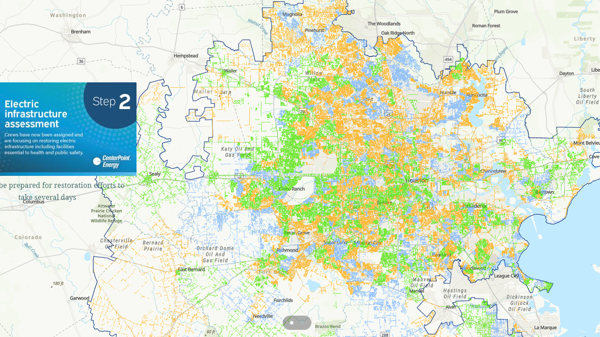 - Orange means CenterPoint is still assessing damage